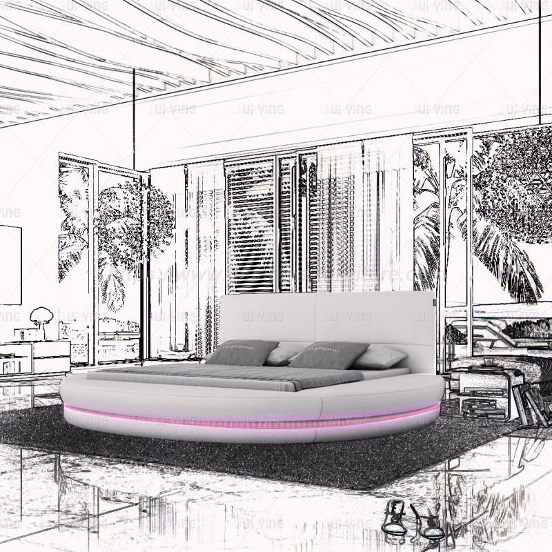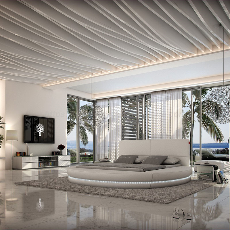 Katil bulat diperbuat daripada bahan berkualiti tinggi, dengan kemasan muka pepejal 18mm dan kulit berkualiti tinggi. Bahagian tepi katil dilengkapi dengan tali pinggang ringan, supaya anda boleh tinggal di dalam bilik yang selesa dan berasa riang